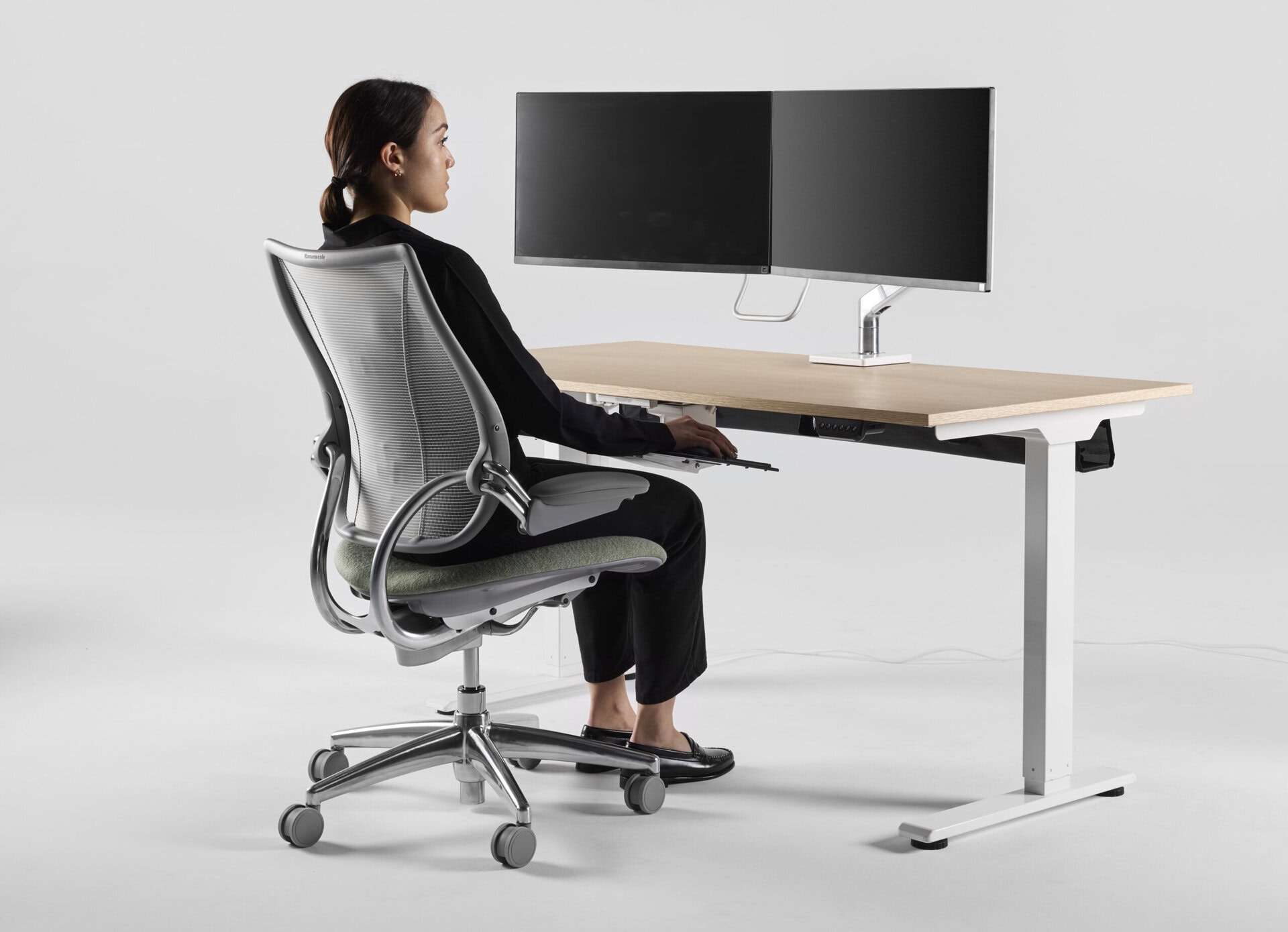Humanscale monitor arms solve this by enabling precise ergonomic positioning of one or more screens. Their weight-compensating mechanisms allow users to effortlessly adjust height, tilt, angle and depth. This ensures each user, whether sitting, standing (or alternating between the two), can achieve an optimal viewing position instantly.