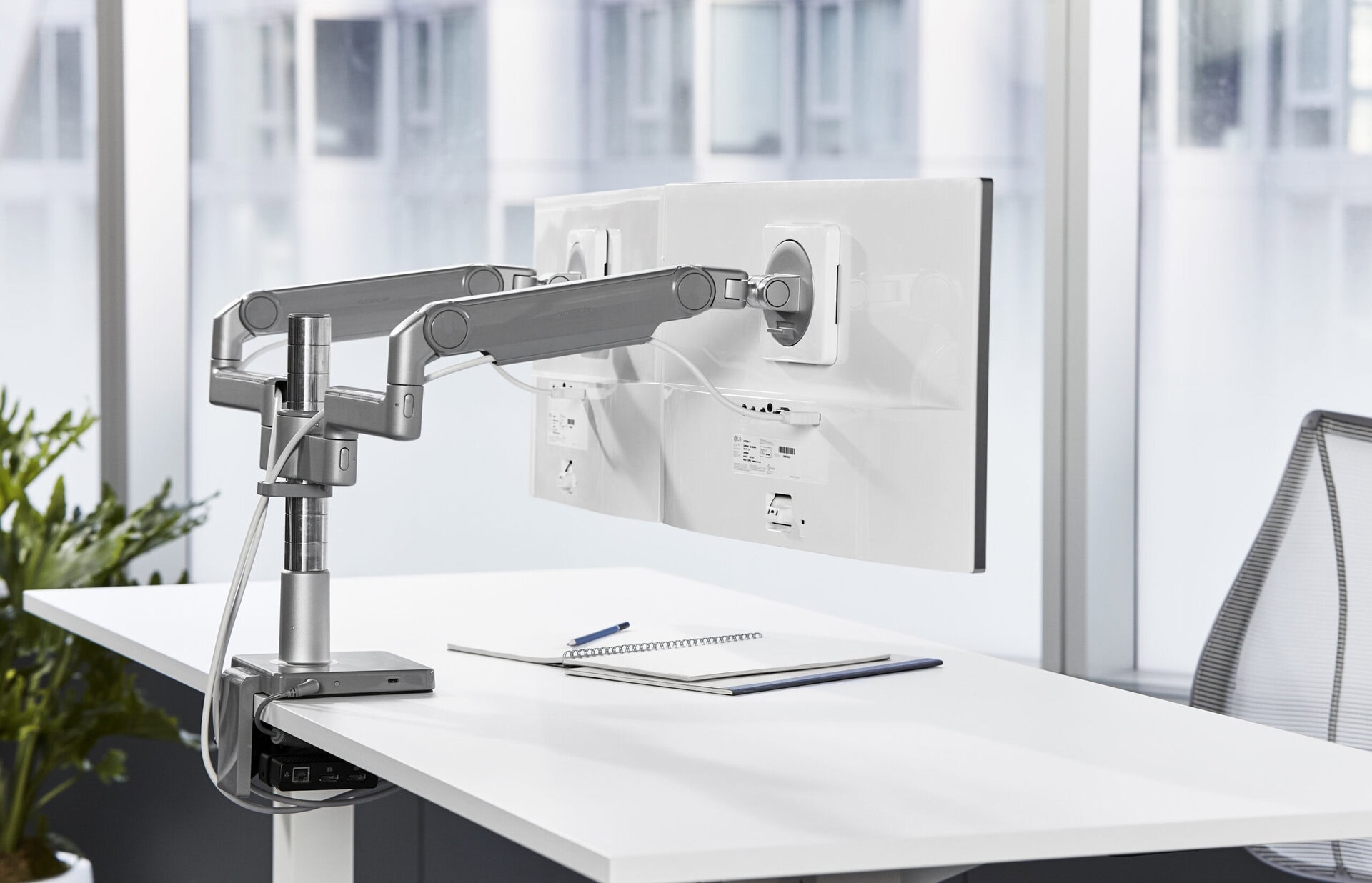 A streamlined, clean workstation set up is a given with Humanscale’s monitor arms and integrated technology solutions. However, it is the ergonomic benefit to the user that is most valuable. Most people don’t naturally position their monitor at the correct height or distance. Traditional monitor stands often force users into uncomfortable leaning or hunching postures, contributing to neck strain, eye fatigue, shoulder tension and overall discomfort during a full workday.